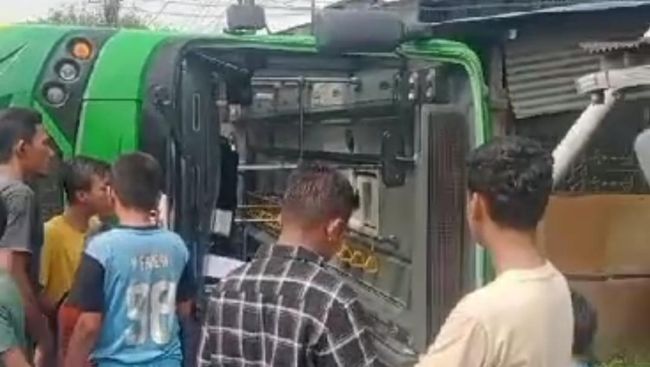 Bus Trans Metro Deli terbalik di Jalan KL Yos Sudarso, Medan. Seorang mahasiswa yang menjadi penumpang sempat pingsan saat bus terbalik.