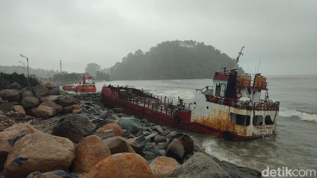 Dua kapal pengangkut BBM terdampar di sebelah masjid Al-Hakim pantai Padang, Sumatera Barat (Sumbar). Kapal tujuan Mentawai itu terdampar setelah terseret ombak yang menyebabkan tali pengikat putus.