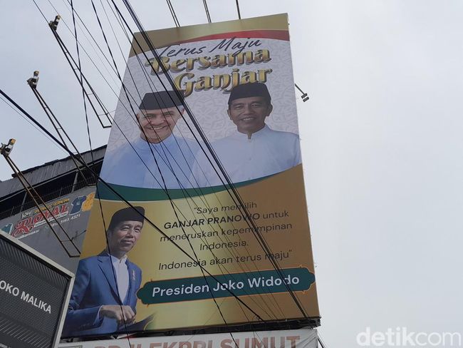 Pantauan detikSumut, Senin (17/7/2023), baliho tersebut terpampang di Jalan Sisingamangaraja dekat Masjid Raya Al-Mashun. Jokowi dan Ganjar terlihat memakai baju putih dengan mengenakan peci hitam.