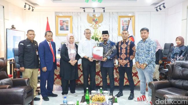 Proses penyerahan dokumen KIP Aceh berlangsung di Gedung KPU Pusat di Jakarta Pusat, Rabu (26/7/2023). Rombongan DPRA dipimpin Ketua Komisi I Iskandar Usman Alfarlaki dan dari KPU dihadiri Ketua Hasyim Asy'ari dan Sekjend KPU RI Bernad Dermawan Sutrisno.