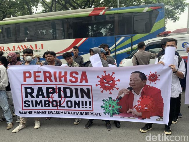 "Dengan ini mendesak dan meminta Kejaksaan Tinggi Sumatera Utara untuk memeriksa keterlibatan mantan Bupati Rapidin Simbolon selaku penanggung jawab Gugus Tugas Percepatan Penangan COVID-19 di Kabupaten Samosir dengan anggaran Rp 1,8 miliar," kata koordinator aksi dari Aliansi Mahasiswa Sumatera Utara, Rahmat, Kamis, (24/8/2023).
