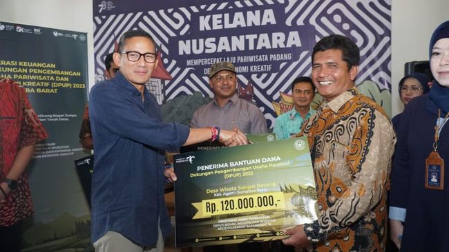 Bantuan tersebut diserahkan oleh Menparekraf Sandiaga Salahuddin Uno di Gedung Gebouw van Padangsch Spaarbank, Kota Padang, Sabtu (9/9/2023). Menurut Sandi, bantuan berbentuk uang ini merupakan bentuk dukungan dari Pengembangan Usaha Parekraf (PUP) bagi desa yang memperoleh Anugerah Desa Wisata Indonesia (ADWI) Tahun 2021 dan 2022.