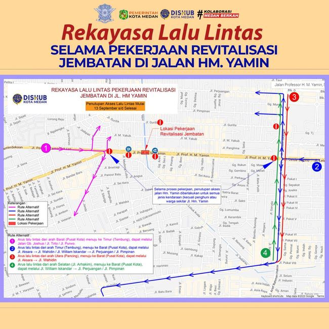 Dinas Perhubungan (Dishub) Kota Medan akan melakukan rekayasa lalu lintas (lalin) selama penutupan Jalan HM Yamin akibat adanya pekerjaan perbaikan jembatan di jalan itu. Rekayasa lalin ini dilakukan agar aktivitas masyarakat tidak terganggu selama proyek berjalan.