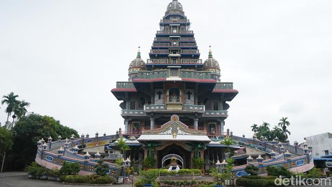 Begitu melangkah masuk, bangunan bak menara tinggi menyerupai kuil berdiri megah dengan jembatan layang yang seakan-akan mendekap dari sisi kanan dan kiri. Meriahnya warna merah, hijau, biru, putih, hingga keemasan menghiasi bangunan indah nan menakjubkan ini.