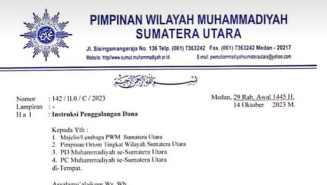 Hal diketahui dari surat Nomor: 142/110/C/2023 dalam hal Instruksi Penggalangan Dana. Surat tersebut di tanda tangani oleh Pimpinan Wilayah Muhammadiyah Sumut Prof Hasyimsyah Nasution.