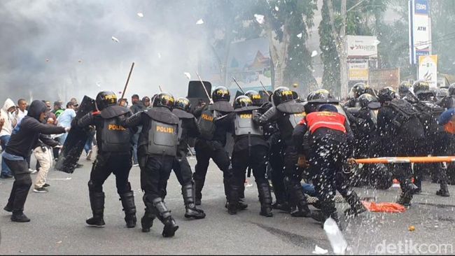 Dalam situasi itu, digambarkan ada massa melakukan protes. Saat itulah situasi mulai pecah, personel Polda Riau dan Sat Brimob yang disiapkan mulai mengamankan lokasi yang dipenuhi massa.