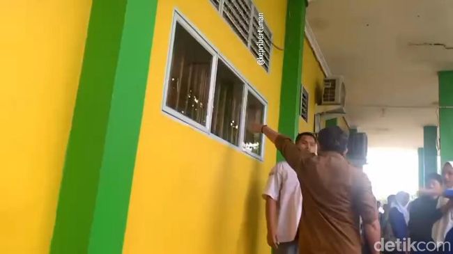 "Hei siapa yang gedor, sudah saya tanya baik-baik tak ada yang jawab," kata guru dalam video tersebut dengan nada tinggi.