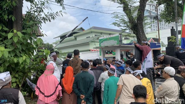 Para pendemo terlihat mengenakan ikat kepala. Seruan takbir berulangkali terdengar kala aksi demo dilaksanakan.