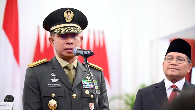 Presiden Joko Widodo (Jokowi) mengusulkan nama Kepala Staf Angkatan Darat (KSAD) Jenderal Agus Subiyanto menjadi Panglima TNI ke DPR. Agus akan menggantikan posisi Panglima TNI Laksamana Yudo Margono yang akan memasuki masa pensiun.