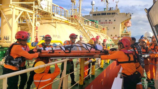 Evakuasi ABK bernama Aswan Ucu (51) dilakukan tim Basarnas Banda Aceh dan pihak terkait, Jumat (3/11/2023). Kapal MT. Smzinnia alias MV Daesung 011 melaporkan adanya ABK yang cidera ke agen perwakilan Aceh lalu diteruskan ke Basarnas.