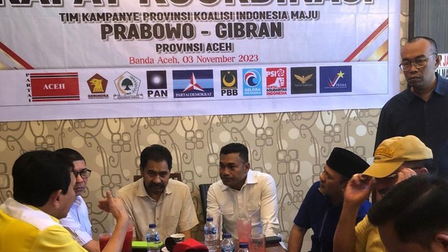 Pertemuan partai Koalisi Indonesia Maju (KIM) berlangsung di salah satu restoran di Banda Aceh, Jumat (3/11/2023). Pertemuan tersebut dengan agenda membahas pemenangan Prabowo-Gibran di wilayah Aceh itu dihadiri pengurus Partai Gerindra, Golkar, PAN, Demokrat, PBB, Gelora, PSI, Garuda dan partai Prima.