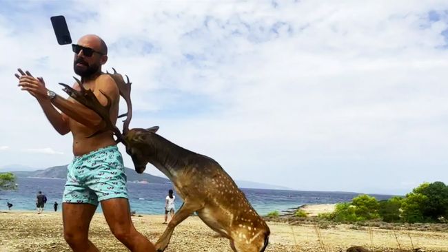 Nasib tidak mengenakkan dialami oleh seorang turis. Awalnya, dia hendak selfie bersama seekor rusa, namun malah menjadi petaka. Dia diseruduk oleh rusa tersebut.