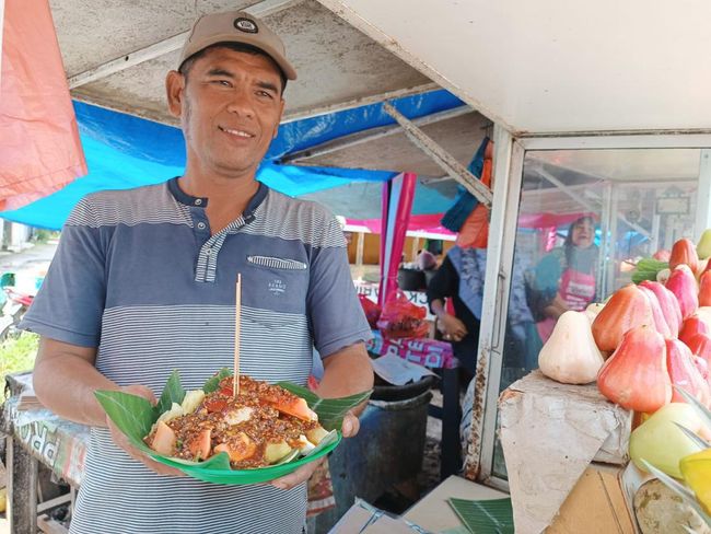 "Kalau biasanya orang bilang, ini rujak Simpang Jodoh, terkenal lezat dengan bumbu kental dan buah segar," kata pria bertopi cokelat dengan kaus biru bergaris-garis.