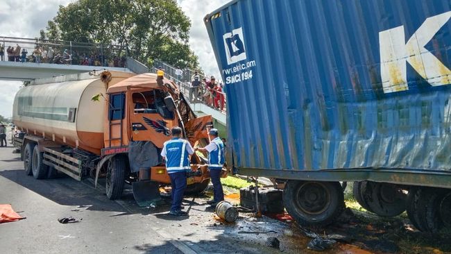 Tabrakan antara truk tangki dan truk trailer terjadi di Jalan Tol Belmera, Kecamatan Medan Belawan, Kota Medan. Akibatnya, satu orang tewas di tempat.