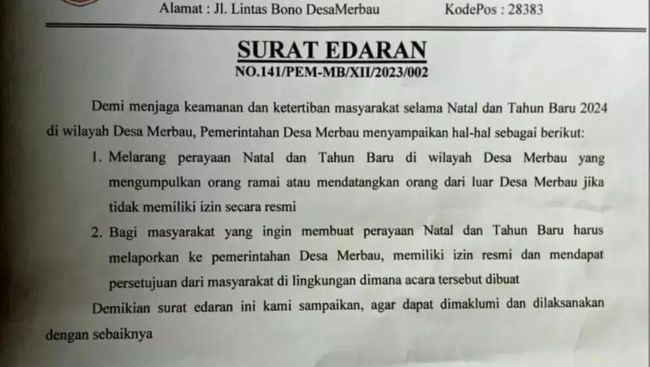 Surat edaran itu bernomor 141/PEM--MB/XII/2023/002 dengan dibubuhi logo pemerintah desa tersebut. Ada dua poin larangan perayaan Natal dan Tahun Baru yang tertuang dalam surat itu.
