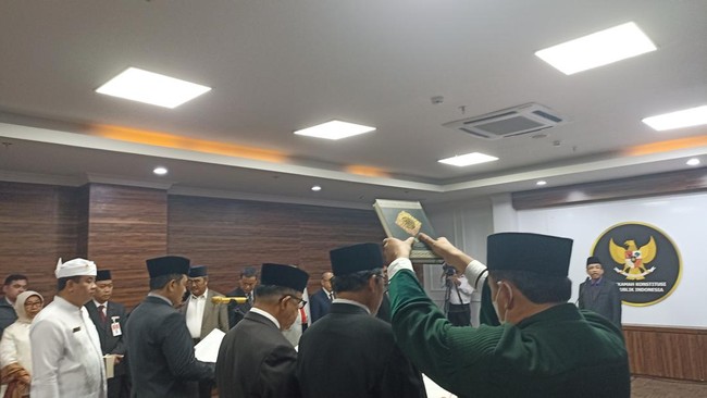 Jakarta - Tiga orang mengucapkan sumpah sebagai Mahkamah Kehormatan MK (MKMK) permanen pada Senin (8/1). Pengucapan sumpah itu disampaikan di hadapan Ketua MK Suhartoyo. Ketiga orang itu adalah Eks hakim Mahkamah Konstitusi (MK) I Dewa Gede Palguna, akademisi Yuliandri, dan hakim konstitusi aktif Ridwan Mansyur.