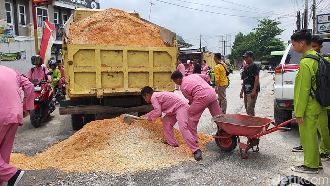 Sehari kemudian atau tepat hari ini, giliran pelajar SMK Muhammadiyah II Jalan Cipta Karya beraksi. Mereka menimbun jalanan yang berlubang dengan memesan dua truk tanah timbun.