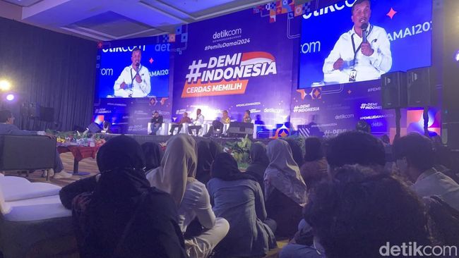 Para peserta #Demi Indonesia Cerdas Memilih yang digelar detikcom dan Kementerian Komunikasi dan Informatika (Kemenkominfo) memadati ruang Convention 2 Hotel Santika Premiere Dyandra, Kota Medan. Saking ramainya, peserta sampai duduk lesehan di dalam ruangan.