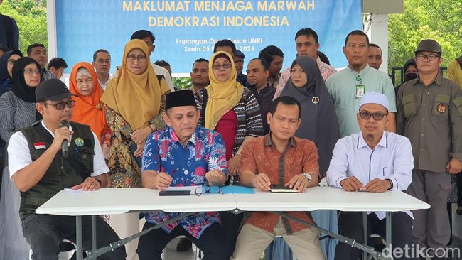 Maklumat itu dibacakan di Lapangan Open Space pagi ini. Terlihat hadir Ketua Presidium Forum Dosen Universitas Riau Dr Junaidi. Lalu ada juga Dr Arifuddin, Dr Hengki Firmanda, Dr Zulkarnain Umar serta sejumlah dosen, pegawai dan mahasiswa ikut membacakan 'Maklumat Menjaga Marwah Demokrasi Indonesia'.