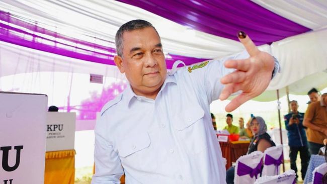 Gubernur mencoblos ditemani sang istri, Suti Mulyati. Hanya sekitar 5 menit Edy Natar masuk ke bilik suara untuk coblos lima surat suara dari patugas di TPS 04.