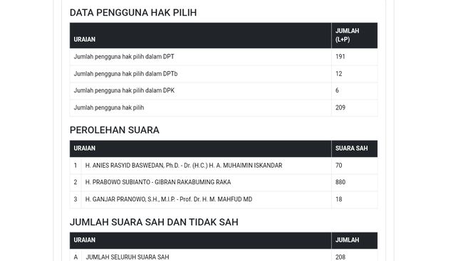 Pasangan nomor urut 1 Anies-Muhaimin mendapatkan 70 suara berdasarkan Sirekap dan formulir C hasil. Sementara pasangan nomor urut 2 Prabowo-Gibran mendapatkan 120 suara, namun pada Sirekap tercatat 880.