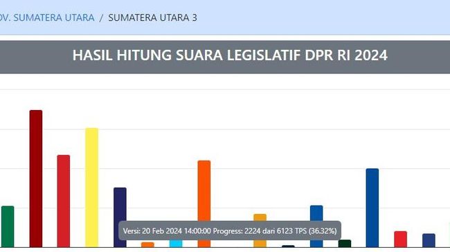 Dilihat detikSumut, Selasa (20/2/2024) di situs pemilu2024.kpu.go.id, jumlah surat suara yang masuk sudah mencapai 36,32% atau 2.224 dari 6.124 TPS. Update real count KPU ini per pukul 14.00 WIB siang ini.