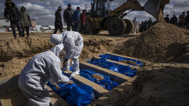 Jakarta - Sebanyak 47 jenazah warga Palestina dikembalikan oleh Israel ke Gaza untuk dimakamkan di Rafah, Kamis (7/3). Puluhan jenazah tersebut sebelumnya diambil paksa oleh Israel dari kuburan di sekitar Rumah Sakit Nasser di Khan Younis untuk disimpan dalam waktu lama.
