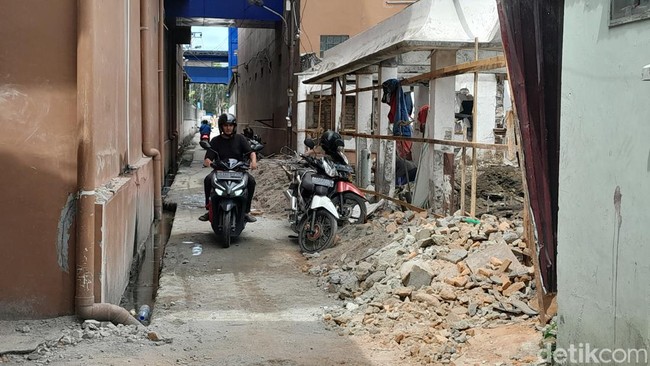 Berdasarkan pantauan tim detikSumut di lokasi pukul 11.12 WIB, memang terlihat masih terdapat sejumlah material bekas tembok di sisi jalan. Bahkan di bagian tengah, terdapat alat bangunan yang membuat becak warga tidak bisa lewat dan hanya dapat dilewati oleh sepeda motor.