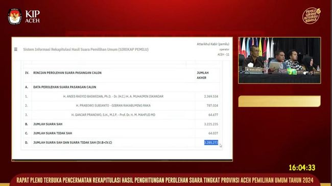 Komisi Independen Pemilihan (KIP) Aceh telah merampungkan rekapitulasi perhitungan suara untuk pasangan calon presiden dan calon wakil presiden tahun 2024. Pasangan nomor urut 01 Anies Baswedan-Muhaimin Iskandar unggul dengan perolehan 2,3 juta suara.