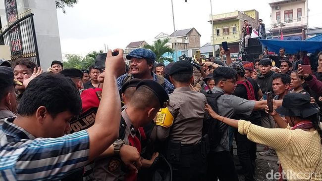 Pantauan detikSumut, Senin (25/3/2024), ricuh itu terjadi sekitar pukul 14.15 WIB. Saat itu, mahasiswa dan masyarakat telah berada di dalam Polda Sumut, di dekat pintu gerbang yang telah dibuka. Di hadapan mereka ada petugas kepolisian yang telah berbaris menahan massa.
