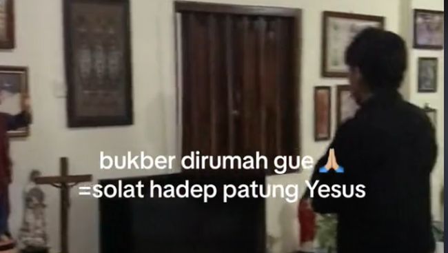 Akun TikTok @a.mannddaa mengatakan jika di rumahnya penuh dengan patung Yesus. Sehingga menurutnya saat teman-temannya salat mau tak mau menghadap ke patung Yesus.