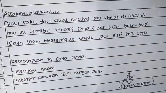 Jujur saja, dari awal melihatmu salat di masjid. Hati ini berdebar kencang, saya tidak bisa basa-basi. Saya ingin meminangmu untuk jadi istri kedua saya. Kemampuan yang saya punya menjadi imam dan memperlakukan istri dengan adil," tulis isi surat tersebut dari pria bernama Zakir Zakaria.