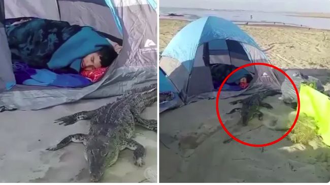 Kejadian unik terjadi saat seorang turis berkemah di pantai. Tiba-tiba ada seekor buaya yang muncul dan tidur di dekatnya.