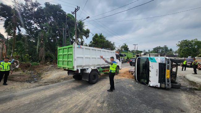 Truk yang mengangkut material tanah terbalik dan menyebabkan kemacetan lalu lintas di Kabupaten Deli Serdang, Sumatera Utara (Sumut). Pihak kepolisian menilang sopir truk itu.