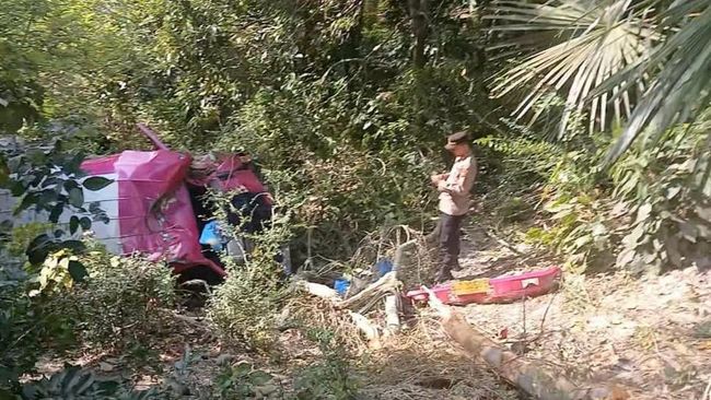 Microbus Isuzu Elf yang mengangkut puluhan penumpang masuk ke jurang sedalam 15 meter di Aceh Besar, Aceh. Puluhan orang yang hendak berwisata mengalami luka-luka.