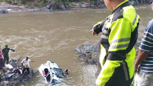 Mobil yang membawa satu keluarga terjun ke sungai di Kabupaten Mandailing Natal (Madina), Sumatera Utara (Sumut). Mobil itu berisi 10 orang.