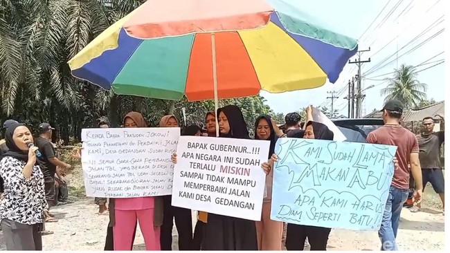 "Bukan saja tentang jalan rusak. Kalau musim panas begini ini abunya kemana-mana sampai masuk rumah. Saya saja yang orang jualan makanan di depan rumah sudah enggak buka lagi karena gak ada yang mau beli. Kami jualan banyak abu," kata Sulastri, emak-emak yang ikut aksi.