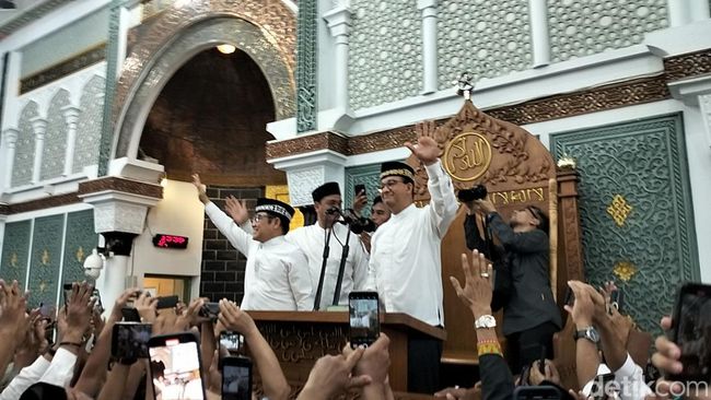 Pantauan detikSumut, Anies dan Cak Imin melaksanakan salat Jumat di Masjid Raya Baiturrahman Banda Aceh, Jumat (3/5/2024). Keduanya tampak mengenakan koko putih serta peci hitam.