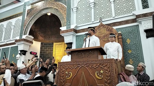 Anies menyapa warga Aceh dari atas mimbar di Masjid Raya Baiturrahman di Banda Aceh, Jumat (3/5/2024). Anies hadir bersama Cak Imin yang juga ikut naik ke mimbar.
