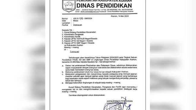 Dinas Pendidikan (Disdik) Kabupaten Asahan mengeluarkan surat edaran yang melarang siswa maupun sekolah melakukan kegiatan study tour ke luar kota. Larangan itu tertuang dalam surat dengan nomor 400.8/1718-UM/2024 yang ditandatangani oleh Kepala Dinas Pendidikan (Kadisdik) Asahan, Supriyanto.