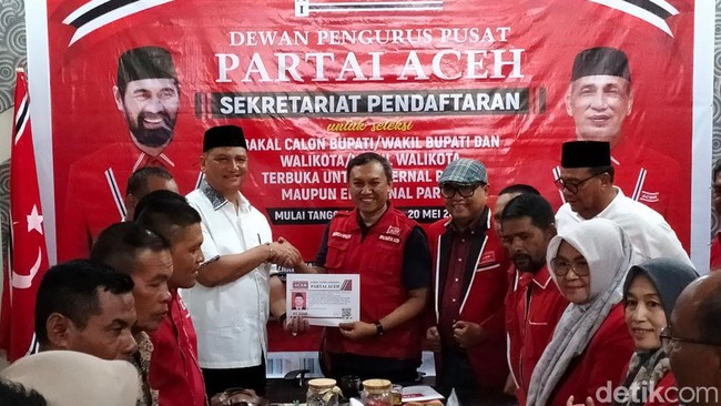 Pantauan detikSumut, Armia menerima KTA Partai Aceh yang diserahkan Juru Bicara Nurzahri di Kantor Partai Aceh di Jalan Dr. Mr. Mohd Hasan, Banda Aceh, Kamis (16/5/2024). Kedatangan Armia didampingi mantan anggota DPR Aceh Sulaiman Abda dan beberapa orang lainnya.