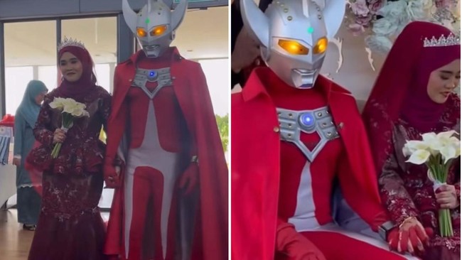 Pernikahan dengan outfit yang tak biasa itu pun viral. Pengantin wanita tampak tersipu malu saat berjalan menuju pelaminan sambil berpegangan tangan dengan Ultraman.