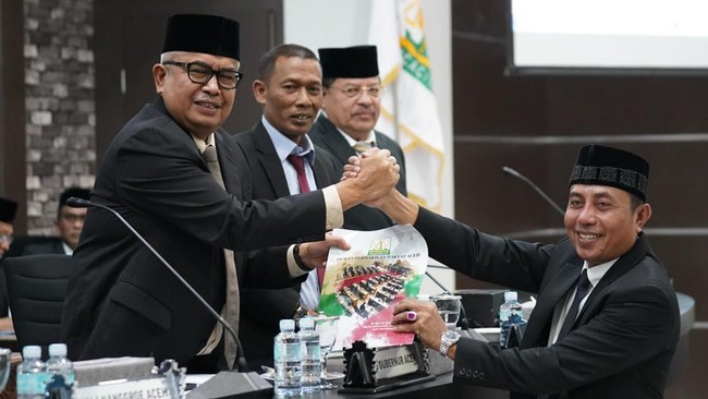 Rapat paripurna tentang penyampaian pendapat badan anggaran (Banggar) DPR Aceh terhadap Rancangan Qanun Aceh tentang Pertanggungjawaban Pelaksanaan APBA 2023 berlangsung di Ruang Serbaguna, Senin (15/7/2024). Paripurna dipimpin Ketua DPR Aceh Zulfadli itu dihadiri Pj Gubernur Aceh Bustami Hamzah dan anggota DPR Aceh.