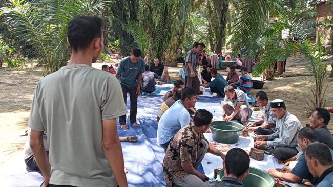 Tampak warga desa ikut bergotong royong menyembelih satu ekor sapi. Hewan ternak itu, berbobot 110 kilogram, diolah menjadi menu gulai daging yang menggugah selera.