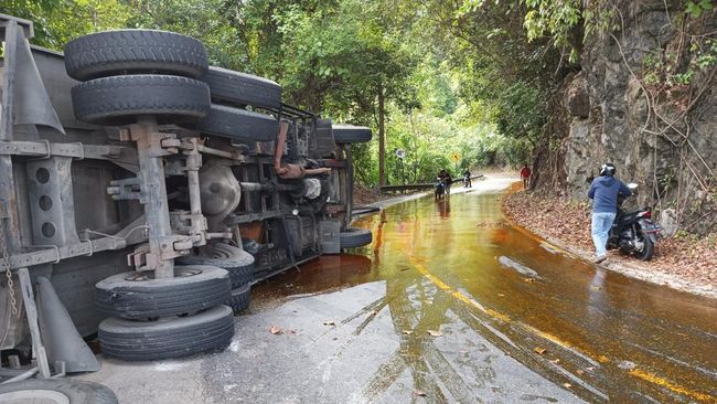Mobil tangki yang mengangkut minyak kelapa sawit (CPO) terbalik di kawasan Gunung Geureutee, Aceh Besar. Jalur menuju kawasan barat Aceh ditutup sementara karena adanya tumpahan minyak di jalan.