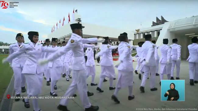 Jakarta - Upacara peringatan detik-detik proklamasi di Ibu Kota Negara (IKN) Jakarta telah dimulai. Sempat menjadi polemik, paskibraka putri tampak ada yang mengenakan jilbab di dalam barisan.