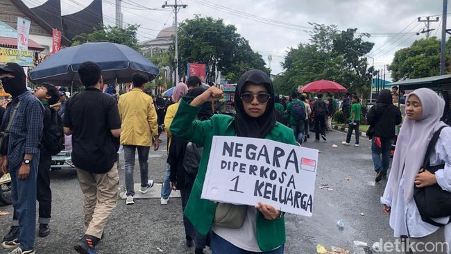 Tak hanya berorasi, massa juga membawa poster. Bahkan salah satu poster yang dibawa seorang mahasiswa bertuliskan "Negara Diperkosa 1 Keluarga" menjadi sorotan.