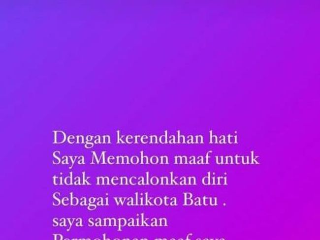 "Dengan kerendahan hati saya memohon maaf untuk tidak mencalonkan diri sebagai Walikota Batu. Saya sampaikan permohonan maaf saya sedalam-dalamnya kepada partai PDIP Perjuangan, ibu ketua umum (Megawati Soekarnoputri) dan masyarakat Kota Batu," tulis Kris Dayanti dalam Insta story melansir detikJatim, Jumat (23/8/2024).