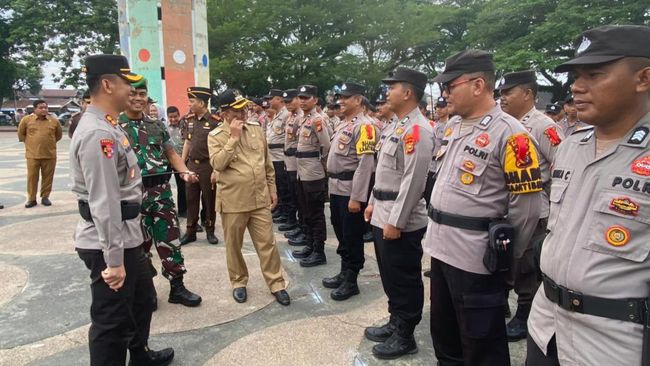 Apel digelar di Ruang Terbuka Hijau (RTH) Beringin, Rengah, Indragiri Hulu. Terlihat sejumlah stakeholder hadir mendampingi AKBP Fahrian dalam pengecekan personel gabungan.