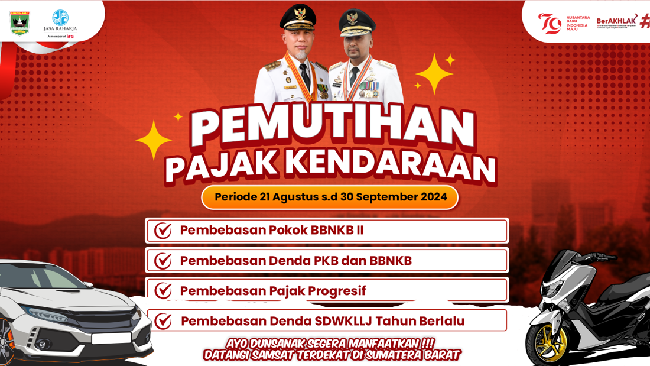 Pemerintah Provinsi Sumatera Barat (Pemprov Sumbar) membuka program penghapusan pajak kendaraan bermotor. Program ini berlangsung dari 21 Agustus hingga 30 September 2024.